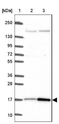 - Western Blot: CutA Antibody [NBP2-39025] - Lane 1: Marker [kDa] 250, 130, 95, 72, 55, 36, 28, 17, 10. Lane 2: Human cell line RT-4. Lane 3: Human cell line U-251MG