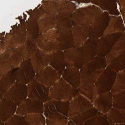 - Immunohistochemical staining of human skeletal muscle shows strong cytoplasmic positivity in myocytes.
