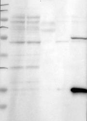 - Band of predicted size in kDa (+/-20%) with additional bands present.