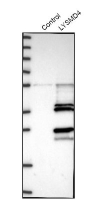 - Western Blot: LYSMD4 Antibody [NBP1-83511] - Analysis in control (vector only transfected HEK293T lysate) and LYSMD4 over-expression lysate (Co-expressed with a C-terminal myc-DDK tag (3.1 kDa) in mammalian HEK293T cells).