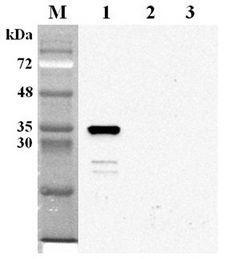 - Western blot analysis using anti-NMNAT2 (human), mAb (Nady-1) at 1:2000 dilution. 1: Human NMNAT2 (His-tagged). 2: Human NMNAT3 (His-tagged). 3: Unrelated (His-tagged) (negative control).