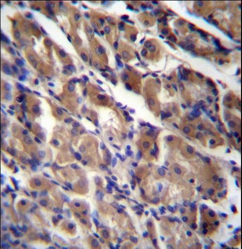 - ABRA Antibody immunohistochemistry of formalin-fixed and paraffin-embedded human stomach tissue followed by peroxidase-conjugated secondary antibody and DAB staining.