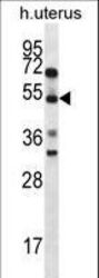 - ABRA Antibody western blot of human normal Uterus tissue lysates (35 ug/lane). The ABRA antibody detected the ABRA protein (arrow).