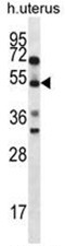 - ABRA Antibody (C-term) (Cat. #AP50033PU-N) western blot analysis in human normal Uterus cell line lysates (35ug/lane).This demonstrates the ABRA antibody detected the ABRA protein (arrow).