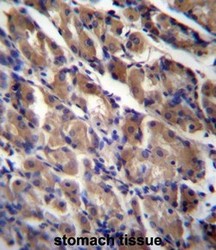 - ABRA Antibody (C-term) (Cat. #AP50033PU-N)immunohistochemistry analysis in formalin fixed and paraffin embedded human stomach tissue followed by peroxidase conjugation of the secondary antibody and DAB staining.This data demonstrates the use of ABRA Antibody (C-term) for immunohistochemistry. Clinical relevance has not been evaluated.