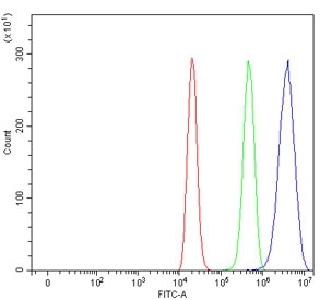 - Flow cytometry testing of human ThP-1 cells with MLX antibody at 1ug/million cells (blocked with goat sera); Red=cells alone, Green=isotype control, Blue= MLX antibody.