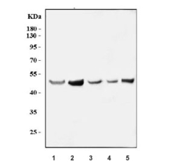 - Western blot testing of 1) human HepG2, 2) human MCF7, 3) human SiHa, 4) monkey COS-7 and 5) mouse HEPA1-6 cell lysate with MLX antibody. Predicted molecular weight ~33 kDa, commonly observed at 30-50 kDa.