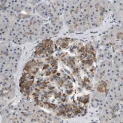 - Immunohistochemical staining of human pancreas shows strong cytoplasmic positivity in islet cells.