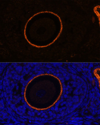 - Immunofluorescence analysis of mouse oophoroma cells using ZP3 antibody (STJ115122) at dilution of 1:100. Blue: DAPI for nuclear staining.