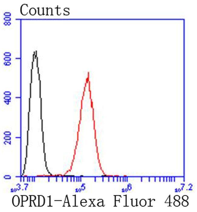 - Flow Cytometric analysis of OPRD1 in SH-SY-5Y cells using a OPRD1 Monoclonal Antibody (Product # MA5-32338) at a dilution of 1:50, as seen in red compared with an unlabelled control (cells without incubation with primary antibody; black). Alexa Fluor 488-conjugated goat anti rabbit IgG was used as the secondary antibody.