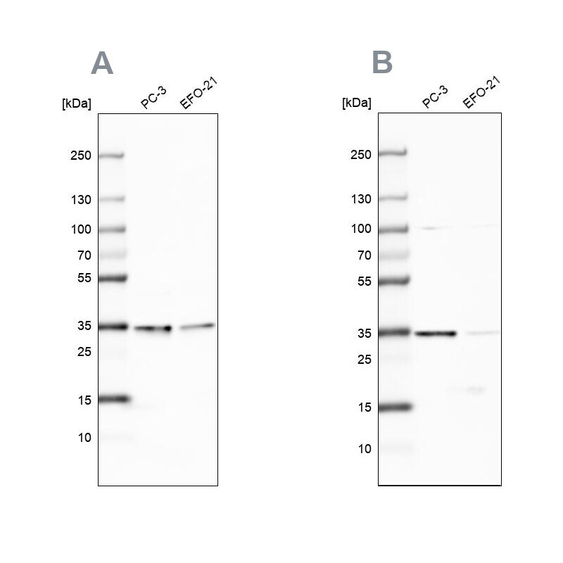- Western blot analysis of DNAJC9 using DNAJC9 Polyclonal Antibody (Product # PA5-57199) (A) shows similar pattern to an independent DNAJC9 Polyclonal Antibody (B).