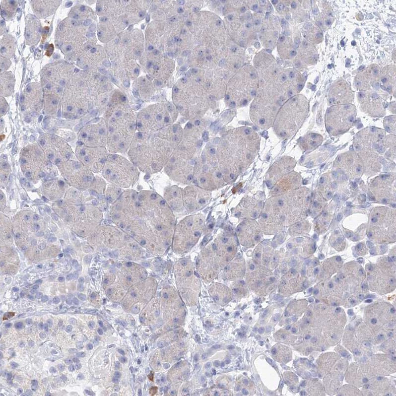 - Immunohistochemical analysis of VSIG1 in human pancreas using VSIG1 Polyclonal Antibody (Product # PA5-57605) shows no membranous positivity in exocrine glandular cells as expected.