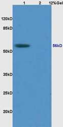 - Lane 1: human colon carcinoma lysates Lane 2: rat brain lysates probed with Anti RCC2 Polyclonal Antibody, Unconjugated (bs-7768R) at 1:200 in 4°C. Followed by conjugation to secondary antibody (bs-0295G-HRP) at 1:3000 90 min in 37°C. Predicted band 56 kD. Observed band size: 56 kD.