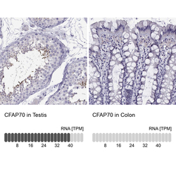 - Immunohistochemistry analysis in human testis and colon tissues using Anti-CFAP70 antibody. Corresponding CFAP70 RNA-seq data are presented for the same tissues.
