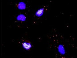 - Proximity Ligation Analysis of protein-protein interactions between OSM and COL4A6. HeLa cells were stained with anti-OSM rabbit purified polyclonal 1:1200 and anti-COL4A6 mouse monoclonal antibody 1:50. Each red dot represents the detection of protein-protein interaction complex, and nuclei were counterstained with DAPI (blue).