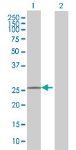 - Western Blot analysis of C9orf152 expression in transfected 293T cell line (H00401546-T01) by C9orf152 MaxPab polyclonal antibody.Lane 1: C9orf152 transfected lysate(23.98 KDa).Lane 2: Non-transfected lysate.