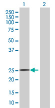 - Western Blot analysis of ZNF501 expression in transfected 293T cell line (H00115560-T01) by ZNF501 MaxPab polyclonal antibody.Lane 1: ZNF501 transfected lysate(28.82 KDa).Lane 2: Non-transfected lysate.