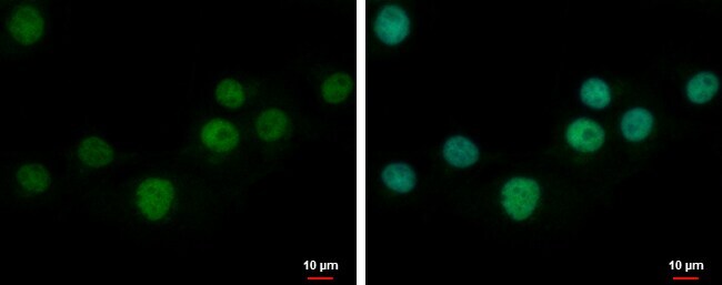- ZNF501 Polyclonal Antibody detects ZNF501 protein at nucleus by immunofluorescent analysis. Sample: U87-MG cells were fixed in 4% paraformaldehyde at RT for 15 min. Green: ZNF501 protein stained by ZNF501 Polyclonal Antibody (Product # PA5-30734) diluted at 1:500. Blue: Hoechst 33342 staining.
