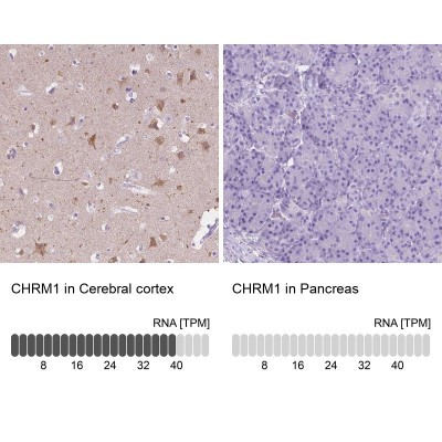 - Immunohistochemistry-Paraffin: Muscarinic Acetylcholine Receptor M1/CHRM1 Antibody [NBP1-87466] - Staining in human cerebral cortex and pancreas tissues using anti-CHRM1 antibody. Corresponding CHRM1 RNA-seq data are presented for the same tissues.