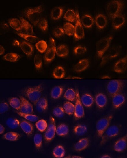 - Immunocytochemistry-Immunofluorescence analysis of ATL2 was performed in HeLa cells using ATL2 Polyclonal Antibody (Product # PA5-90788) at a dilution of 1:100. Blue: DAPI for nuclear staining.