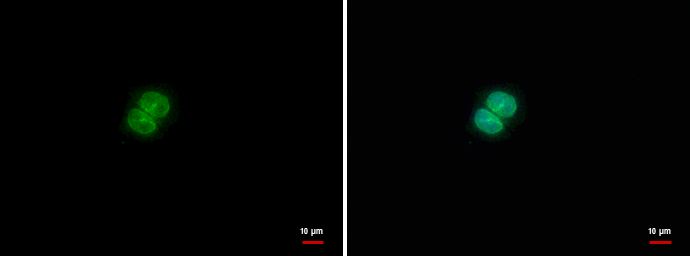 - U2AF1L4 antibody detects U2AF1L4 protein at nucleus by immunofluorescent analysis.Sample: HCT116 cells were fixed in 4% paraformaldehyde at RT for 15 min.Green: U2AF1L4 protein stained by U2AF1L4 antibody (GTX119283) diluted at 1:500.Blue: Hoechst 33342 staining.