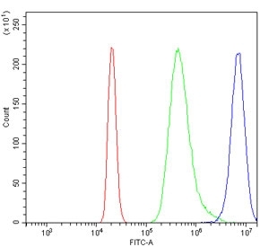 - Flow cytometry testing of mouse RAW264.7 cells with Tspan8 antibody at 1ug/million cells (blocked with goat sera); Red=cells alone, Green=isotype control, Blue= Tspan8 antibody.