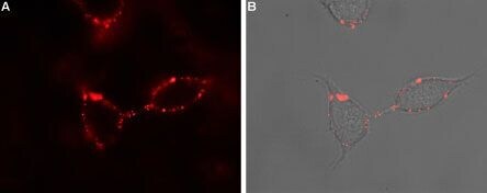 - Expression of P2RY1 in rat PC12 cells - Cell surface detection of P2RY1 in intact living rat pheochromocytoma PC12 cells. A. Extracellular staining of cells using Anti-P2Y1 Receptor (extracellular) Antibody (#APR-021), (1:50) followed by goat Anti-rabbit-AlexaFluor-594 secondary Antibody (red). B. Merge of extracellular staining with live view of the cells.