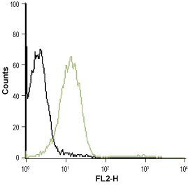 - Cell surface detection of P2RY1 in Jurkat (human acute T cell leukemia) living cells: - (black) Unstained cells. (red) Cells stained + Anti-P2Y1 Receptor (extracellular) Antibody (#APR-021), (5 μg/1x106cells).