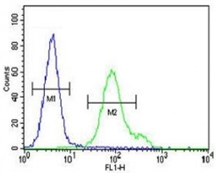 - Nephrin antibody flow cytometric analysis of MDA-MB435 cells (green) compared to a negative control (blue). FITC-conjugated goat-anti-rabbit secondary Ab was used for the analysis.