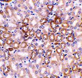 - Immunohistochemistry of Nephrin in mouse kidney tissue with Nephrin antibody at 1 μg/mL.