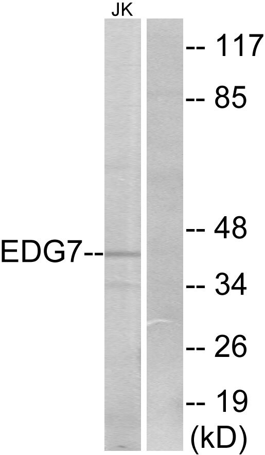 - Western blot analysis of lysates from Jurkat cells, using EDG7 Antibody. The lane on the right is blocked with the synthesized peptide.