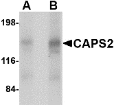 - Western blot of CAPS2 in human brain tissue lysate with CAPS2 antibody at (A) 0.5 and (B) 1 ug/ml.