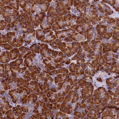 - Immunohistochemistry-Paraffin: CAPS2 Antibody [NBP1-85855] - Staining of human pancreas shows strong cytoplasmic positivity in exocrine glandular cells.