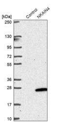 - Western blot analysis of NKAIN4 in control (vector only transfected HEK293T lysate) and NKAIN4 over-expression lysate (Co-expressed with a C-terminal myc-DDK tag (~3.1 kDa) in mammalian HEK293T cells). Samples were probed using a NKAIN4 Polyclonal Antibody (Product # PA5-56280).