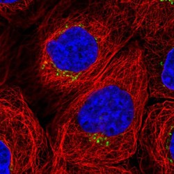 - Immunofluorescent staining of human cell line A-431 shows localization to the Golgi apparatus.