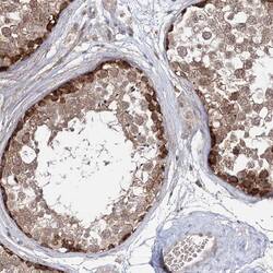 - Immunohistochemical analysis of WDR44 in human testis using WDR44 Polyclonal Antibody (Product # PA5-58242) shows strong cytoplasmic positivity in subset of cells in seminiferous ducts.