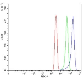 - Flow cytometry testing of human SiHa cells with WDR44 antibody at 1ug/million cells (blocked with goat sera); Red=cells alone, Green=isotype control, Blue= WDR44 antibody.