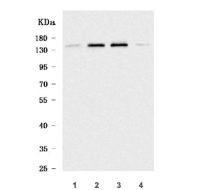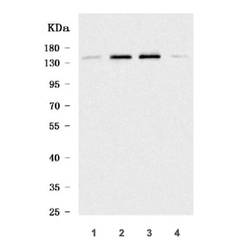 - Western blot testing of human 1) SiHa, 2) HeLa, 3) HEL and 4) A431 cell lysate with WDR44 antibody. Predicted molecular weight ~101 kDa.