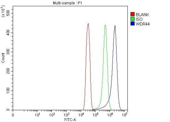- Flow cytometry of WDR44 in SiHa cells (Blue line). The cells were blocked with 10% normal goat serum, and then incubated with WDR44 polyclonal antibody (Product # PA5-144023) (1 µg/1x10^6 cells) for 30 min at 20°C. Isotype control antibody (Green line) was rabbit IgG (1 μg/1x10^6 cells) used under the same conditions. Unlabeled sample (Red line) was also used as a control. DyLight®488 conjugated goat anti-rabbit IgG (5-10 μg/1x10^6 cells) was used as secondary antibody for 30 minutes at 20°C.
