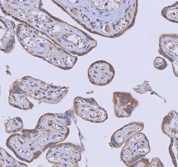 - Immunohistochemistry analysis of WDR44 in paraffin-embedded section of human placenta tissue. Heat mediated antigen retrieval was performed in EDTA buffer (pH 8.0, epitope retrieval solution). The tissue section was blocked with 10% goat serum. Samples were incubated with WDR44 Polyclonal antibody (Product # PA5-144023) using a dilution of 2 μg/mL overnight at 4°C. Peroxidase Conjugated Goat Anti-rabbit IgG was used as secondary antibody and incubated for 30 minutes at 37°C. The tissue section was developed using HRP Conjugated Rabbit IgG Super Vision Assay Kit with DAB as the chromogen.