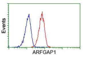 - Flow cytometric analysis of Jurkat cells, using anti-ARFGAP1 antibody (TA502626), (Red), compared to a nonspecific negative control antibody (TA50011), (Blue).