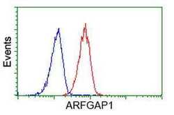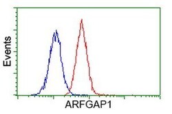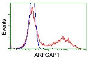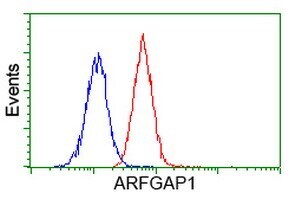- HEK293T cells transfected with either RC206987 overexpress plasmid (Red) or empty vector control plasmid (Blue) were immunostained by anti-ARFGAP1 antibody (TA502626), and then analyzed by flow cytometry.