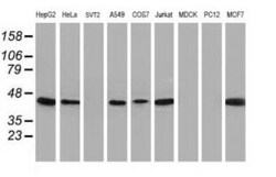- Western blot analysis of extracts (35 µg) from 9 different cell lines by using anti-ARFGAP1 monoclonal antibody.