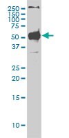 - Western Blot analysis of STK38 expression in transfected 293T cell line by STK38 monoclonal antibody (M01), clone 2G8-1F3.Lane 1: STK38 transfected lysate(54.2 KDa).Lane 2: Non-transfected lysate.
