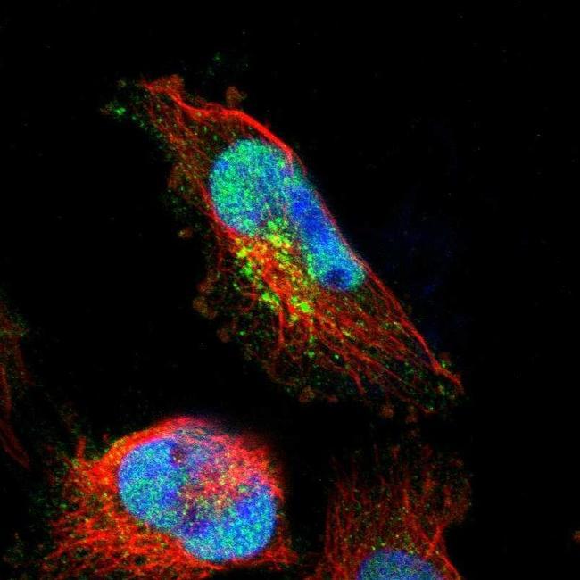 - Immunofluorescent staining of SH3D19 in human cell line U-251 MG shows positivity in the Golgi apparatus & nucleus but excluded from the nucleoli. Samples were probed using a SH3D19 Polyclonal Antibody (Product # PA5-53417).
