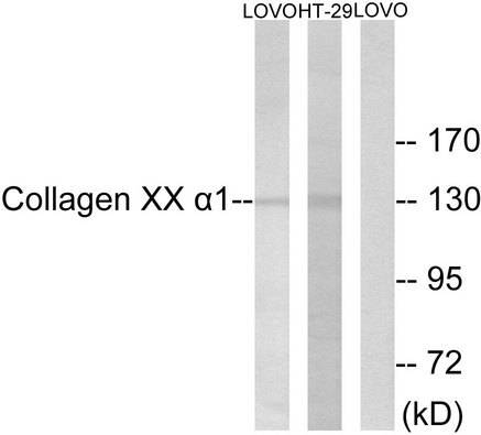 - Western blot analysis of lysates from LOVO and HT-19 cells, using Collagen XX alpha1 Antibody. The lane on the right is blocked with the synthesized peptide.