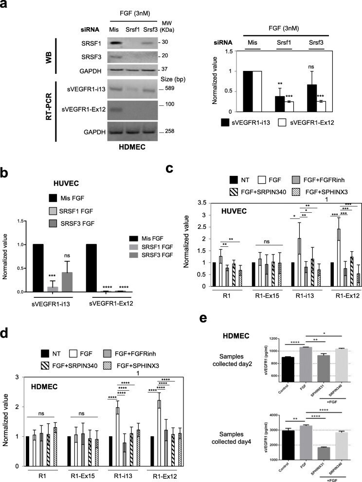 - Fig. 8 FGF-2 mediates accumulation of sVEGFR1 splice variants through a SRSF1/SRSF3/SRPK1-dependent axis. a HDMEC were transfected with control siRNA (mis) or specific SRSF1 (Srsf1) or SRSF3 (Srsf3) siRNA and treated with 3nM FGF-2 for 72 h. Left panel: representative immunoblots of SRSF1 or SRSF3 protein (WB) or PCR analyses (RT-PCR) of sVEGFR1-i13 and sVEGFR1-ex12 mRNA levels. GAPDH was used as a loading/internal control. Right panel: PCR data semi-quantification by ImageJ software. The sVEGFR1/GAPDH ratio obtained in control condition was arbitrarily assigned the value 1. Data are the mean +- SD of 3 and 4 biological replicates for sVEGFR1-ex12 and sVEGFR1-i13, respectively (unpaired t test, ** p
