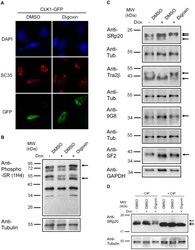 - Figure 6 Digoxin alters the activity of SR protein kinases and induces modification of a subset of SR proteins. (A) To assess the effect of digoxin on CLK kinase function, HeLa rtTA-HIV-Delta Mls cells were transfected with vectors expressing GFP-tagged CLK1. Twenty-four hours post-transfection, cells were treated with DMSO or 100 nM digoxin. After 24 h of treatment, cells were fixed, stained for SC35/SRSF2 nuclear speckles (Texas Red), and nuclei stained with DAPI. Images are representative of the localization patterns observed from >=5 independent experiments. Magnification 630x. (B, C, D) Western blot analysis of the effect of digoxin treatment on SR proteins. Lysates were harvested from HeLa rtTA-HIV-Delta Mls cells treated with 100 nM digoxin or DMSO and were induced with Dox (+) or left uninduced (-) as described in Fig. 1 . Immunoblots were probed by specific antibody for (B) phospho-SR proteins (1H4) or (C) SRp20, Tra2beta1, 9G8, or SF2/ASF (SF2). (D) Cell lysates from above were dephosphorylated by treatment with (+) and without (-) calf intestinal alkaline phosphatase (CIP), then immunoblotted with a SRp20-specific antibody. Arrows on the right indicate the protein specie(s) detected and their modified/unmodified isoform(s). Anti-tubulin (Anti-Tub.) blots for each experiment served as an internal loading control for the relative amount of protein lysate per lane. Immunoblots are representative of >=4 independent trials.