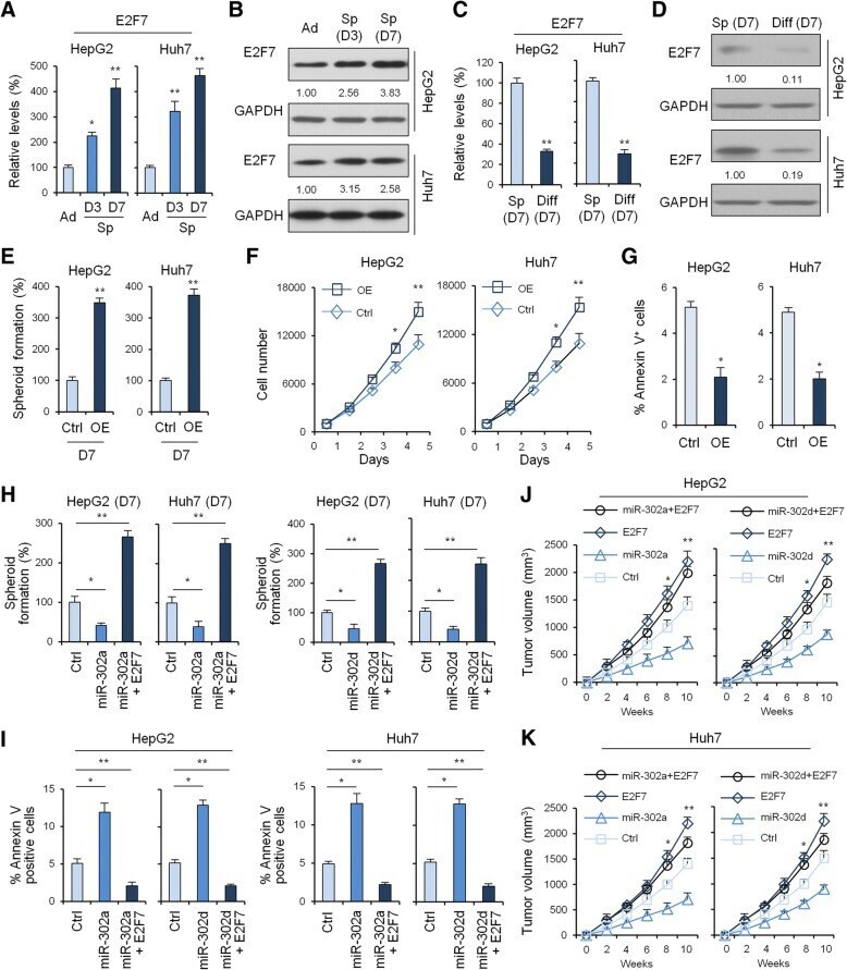 - Fig. 4 Biological role of miRNA-302a/d and E2F7 in HCC in vitro and in vivo. qRT-PCR ( a ) and Western blot ( b ) to quantify E2F7 levels in adherent and tumor spheres of HepG2 and Huh7 cells after 3 and 7 days cultured in stem cell medium containing EGF and bFGF. GAPDH was used as loading control. qRT-PCR ( c ) and Western blot ( d ) to quantify E2F7 levels in tumor spheres of HepG2 and Huh7 cells at Day 7 cultured in stem cell medium and differentiated liver cancer cells. e , Tumor sphere Assays of HepG2 and Huh7 cells before and after overexpression of E2F7. f , HepG2 and Huh7 cell counts in 96-well plate after transfection with negative control and E2F7 overexpression plasmids at the indicated day. g , HepG2 and Huh7 cell apoptosis was examined by flow cytometry analysis before and after overexpression of E2F7. Statistical analyses were performed with one-way ANOVA (*P < 0.05, **P < 0.01, and ***P < 0.001 vs. normal). h , Tumor sphere assays of HepG2 and Huh7 cells before and after overexpression of miRNA-302a/d and/or E2F7. i , HepG2 and Huh7 cell apoptosis was examined by flow cytometry analysis before and after overexpression of miRNA-302a/d and/or E2F7. The subcutaneous tumor capacity of HepG2 and Huh7 cells before and after overexpression of miRNA-302a ( j ) and miRNA-302d ( k ) and/or E2F7 was detected. Statistical analyses were performed with one-way ANOVA (*P < 0.05, **P < 0.01, and ***P < 0.001 vs. normal)