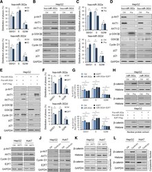 - Fig. 5 The effect of miRNA-302a/d and/or E2F7 on AKT1-cyclin D1 signaling and downstream cell cycle. a , Cell cycle quantitative analysis of HepG2 cells transfected with the miRNA-302a/d knockdown or the control vector. b , Western blot to quantify the effect of miRNA-302a/d knockdown on AKT1-cyclin D1 signaling in HepG2 cells. c , Cell cycle quantitative analysis of HepG2 cells transfected with the miRNA-302a/d overexpression or the control vector. d , Western blot to quantify the effect of miRNA-302a/d overexpression on AKT1-cyclin D1 signaling in HepG2 cells. e , Western blot to quantify the effect of miRNA-302a/d and E2F7 overexpression on AKT1-cyclin D1 signaling in HepG2 cells. f , Cell cycle quantitative analysis of HepG2 cells transfected with the miRNA-302a/d and E2F7 overexpression or the control vector. g , Cell cycle quantitative analysis of CD133 + EpCAM + HepG2 cells transfected with the miRNA-302a/d and/or E2F7 overexpression or the control vector. h , Western blot to quantify the effect of miRNA-302a/d and/or E2F7 on protein levels of intranuclear beta-catenin level in HepG2 cells. Western blot to quantify the effect of AKT1 ( i ) and Cyclin D1 ( j ) on E2F7 protein level in HepG2 and Huh7 cells. Western blot to quantify the effect of AKT1 ( k ) and Cyclin D1 ( l ) on intranuclear beta-catenin level in HepG2 and Huh7 cells